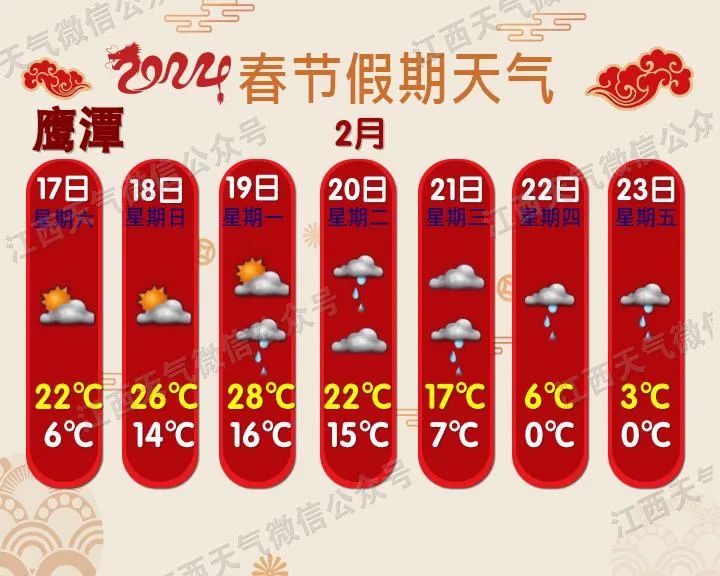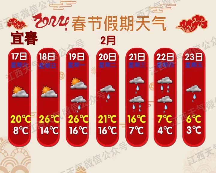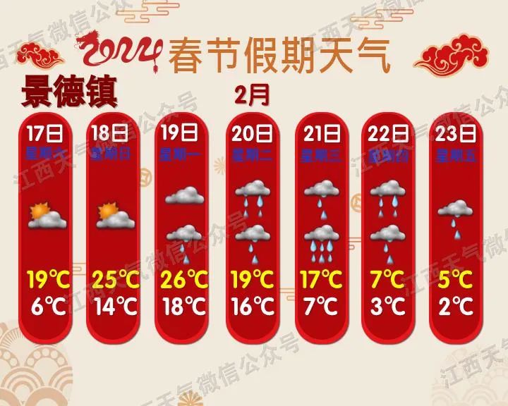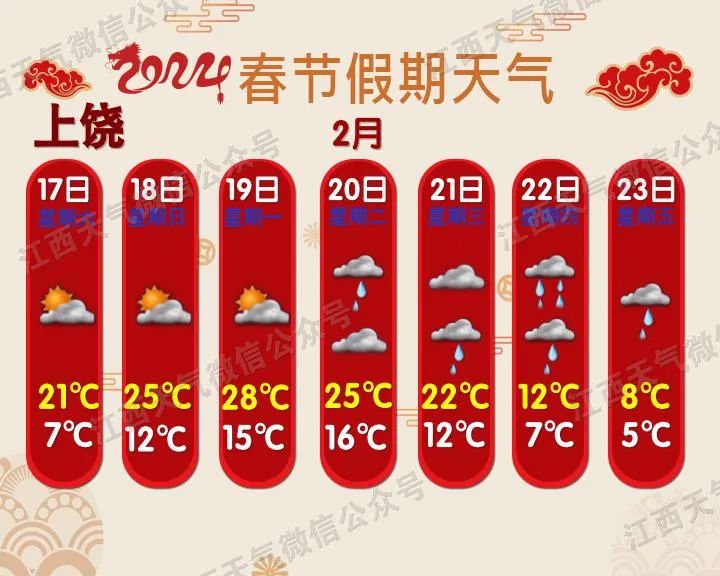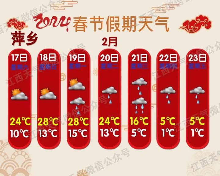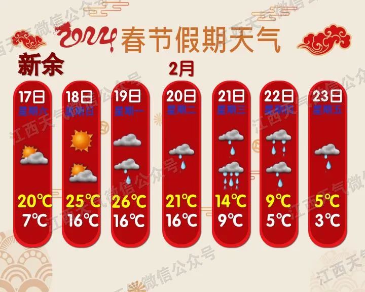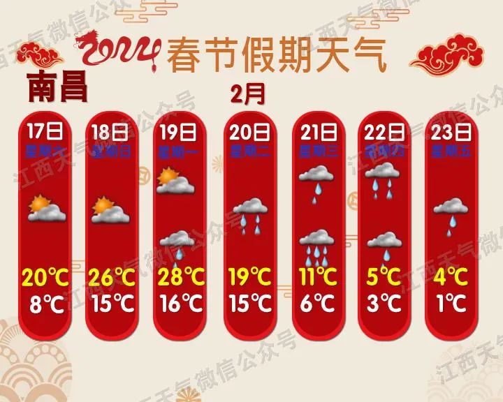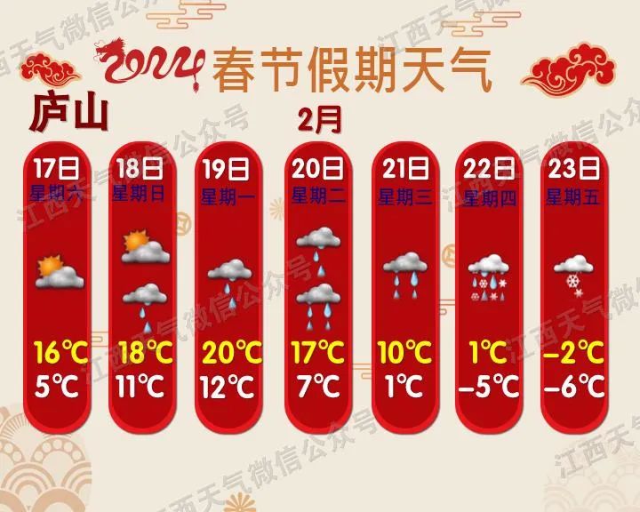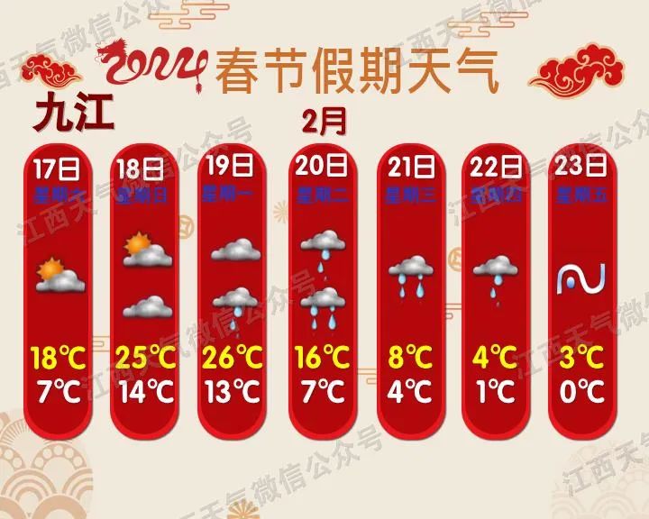 预计今年春运期间(1月26日~3月5日),影响我省的冷空气过程有5次,气温总体偏高但起伏大;雨日和降水偏多;春运中期(2月5~20日),赣北和高海拔山区会出现阶段性低温雨雪天气。