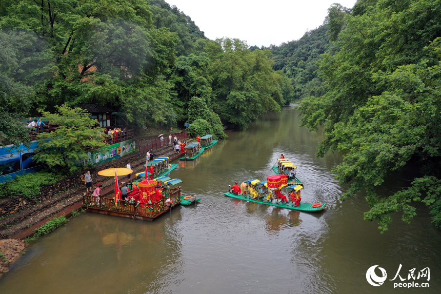 7月12日,在江西省抚州市广昌县杨溪乡抚河源的河道里,游客们乘坐竹筏,置身山水中,享受盛夏里的清凉和惬意。