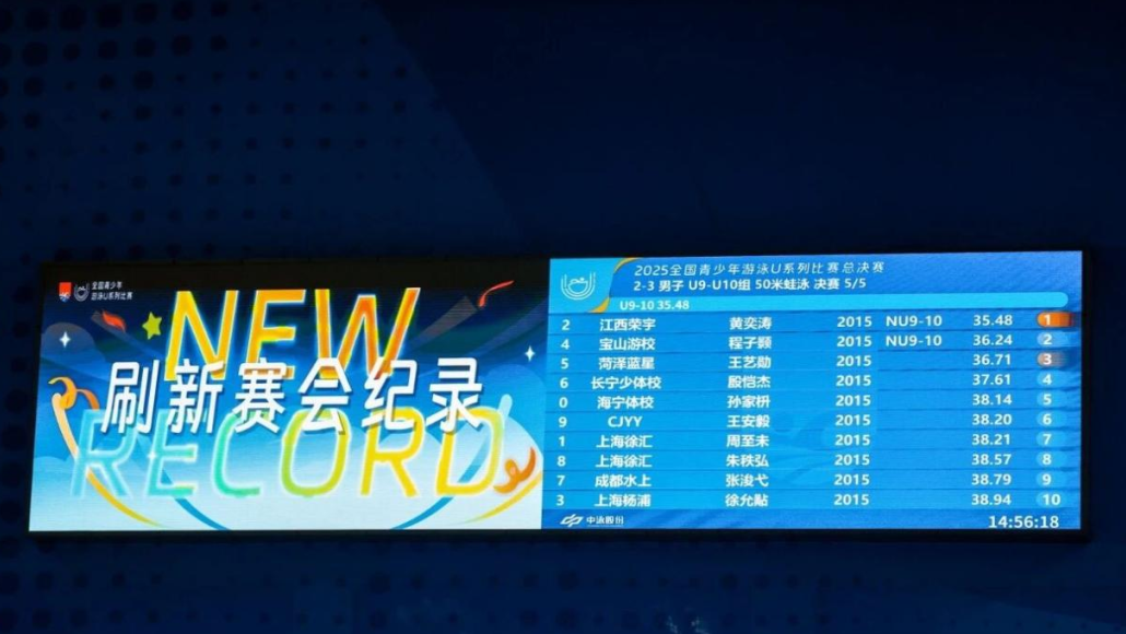 在激烈的角逐中,黄奕涛以35秒48的出色成绩一举夺得男子9—10岁组50米蛙泳项目的冠军,并成功打破赛会纪录。此外,他在100米蛙泳项目中也表现亮眼,获得第四名。耿馨在女子15-16岁组比赛中发挥稳健,荣获100米仰泳第四名、50米自由泳第五名、100米自由泳第七名、50米仰泳第七名,其中50米仰泳成绩达到了国家级健将标准。杨翌在50米蛙泳项目中以32秒45的成绩达到了国家一级运动员标准。