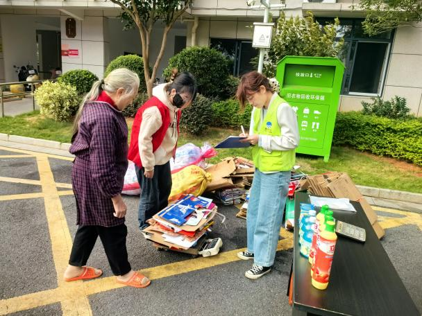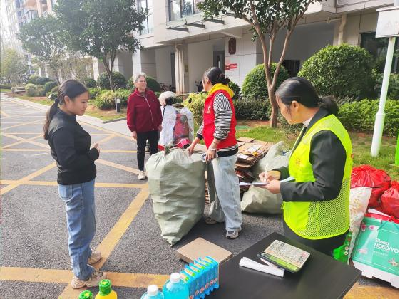 为确保活动有序高效开展,宣传员主动与锦绣华庭小区物业建立沟通机制,就活动场地选址、居民引导等事宜达成共识,形成“政企协同”的筹备合力,另一方面扩大宣传覆盖,通过小区业主微信群发布活动通知,明确活动时间、地点、兑换规则及可回收物品类,以确保居民充分知晓、提前准备,有效激发居民参与热情;活动现场,宣传员提前到位,完成生活礼品(如日用品、清洁用品等)摆放、电子秤调试等准备工作,为活动顺利启动奠定基础。