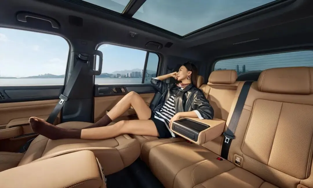 豹8大五座版以“奢野旗舰”姿态切入市场,基于2.0TDMO+平台打造,双电机四驱系统综合功率550千瓦,百公里加速4.8秒,综合续航超1200km。五座布局带来极致空间表现,轴距2920mm的车身赋予后排970mm纵向乘坐空间,后备箱容积达955L,副驾与后排均配备四向可调腿托,搭配双开门高压冷暖冰箱,尽显豪华舒享。