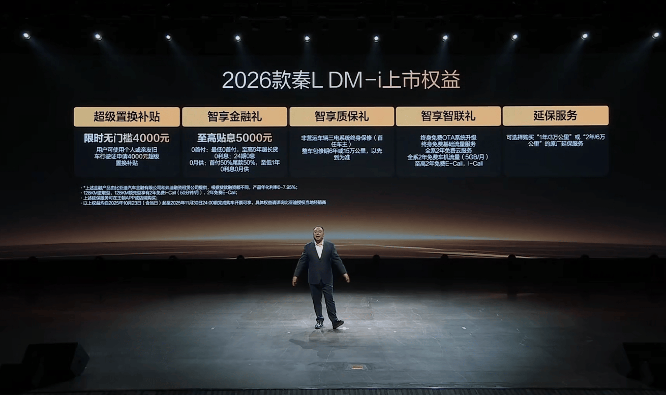 2025年10月23日,比亚迪2026款秦L DM-i正式上市,共2款车型,上市官方售价为9.68-10.68万元,叠加超级置换权益后的限时售价为9.28-10.28万元。此次改款针对车辆内外细节设计进行优化,纯电续航里程提升至128公里,综合续航2148公里,亏电油耗低至2.79升/百公里,以保持产品竞争力。