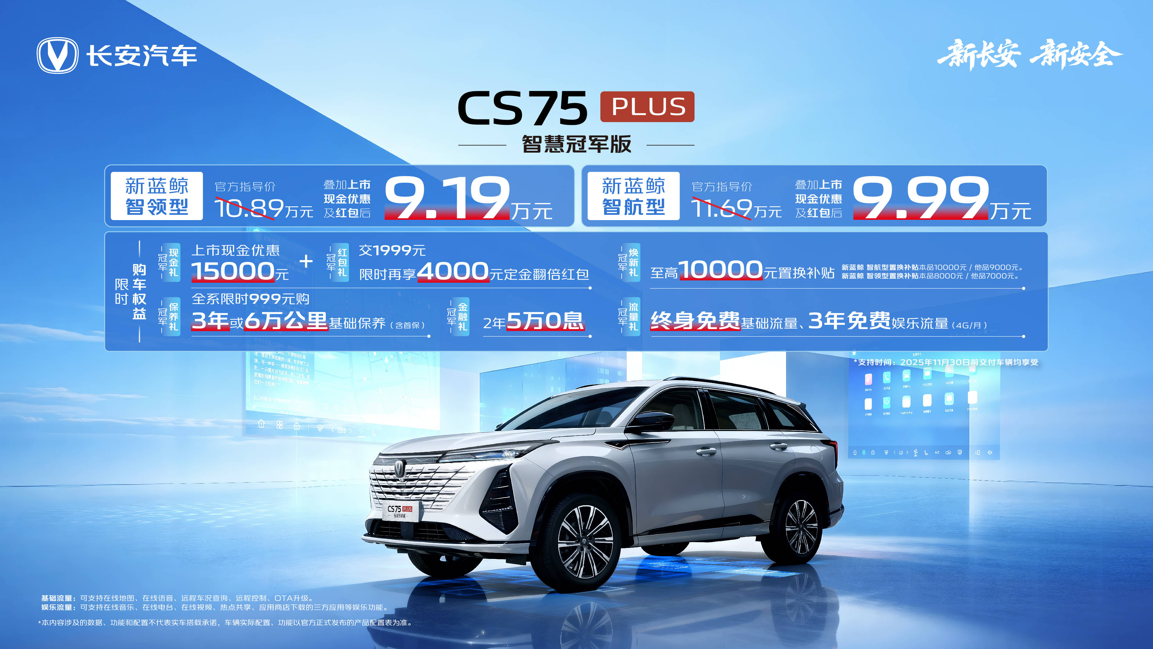 此外,11月30日前,用户交付CS75PLUS智慧冠军版任一配置车型,除了15000元上市现金优惠、交1999元限时再享4000元定金翻倍红包、至高10000元置换补贴外,活动期间,长安汽车更为用户准备了全系限时999元购3年或6万公里基础保养(含首保);2年5万0息;终身免费基础流量、3年免费娱乐流量(4G/月)等多重福利!
