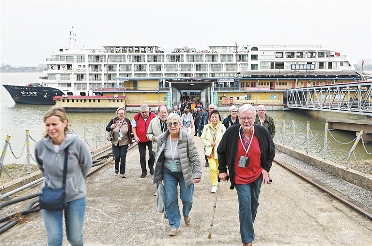 近日,来自欧洲的130余名游客乘坐游轮抵达浔城。(本报记者欧阳海员摄)