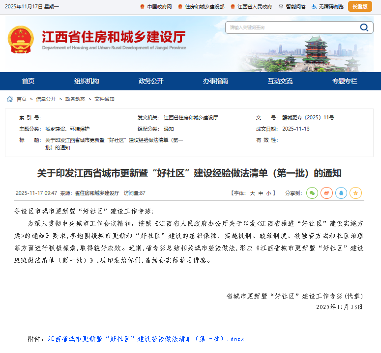 上饶一项经验入选“好社区”建设首批经验做法清单2025-11-18 16:00 阅读 上饶住建上饶市创新“总体谋划+分片实施”工作模式,推进老旧街区改造,入选江西省城市更新暨“好社区”建设经验做法清单(第一批)。 附件: 打开APP阅读全文