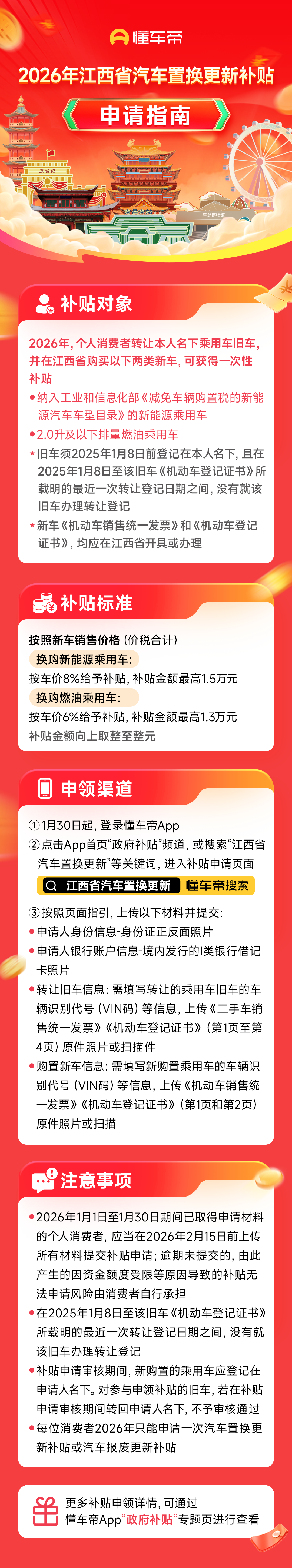 大江新闻讯 全媒体记者杜宇蔚报道:为持续释放汽车消费潜力,近日,江西省商务厅发布公告,2026年江西省汽车置换更新服务平台上线,先期开通本年度汽车置换更新补贴申请资料接收功能。即日起消费者通过懂车帝App“政府补贴”频道,或首页搜索“江西省汽车置换更新”等关键词,即可进入补贴申请页面。置换符合条件的新能源乘用车最高补贴15000元,燃油乘用车最高补贴13000元。