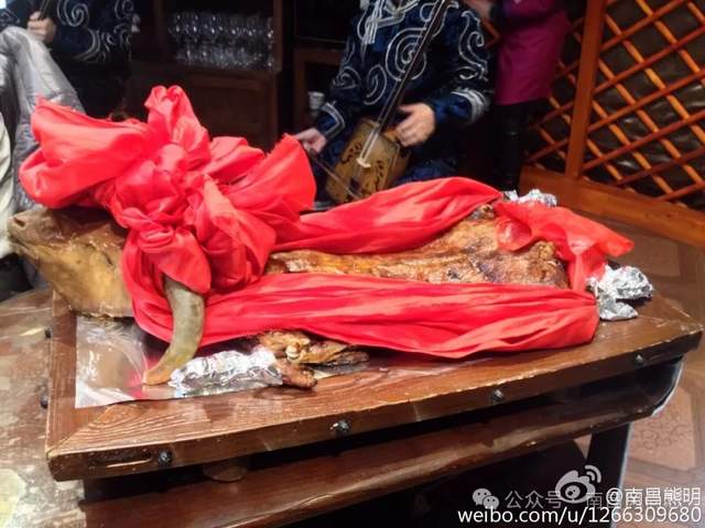 酒过三巡,在蒙古马头琴声中,在身穿蒙古服饰的姑娘、汉子嘹亮悠扬的歌声中,披红挂彩的烤全羊推进来了。程君盛情邀请著名探险家、《赣风》杂志社社长秦洪渊先生与程君一道,为烤全羊剪彩,宾主挥刀,剪彩剖羊,并有身着民族服饰的帅哥美女在旁献酒,歌唱。顿时,蒙古包里面掌声响起来,美酒喝起来,知心的话儿说起来,草原歌曲唱起来……