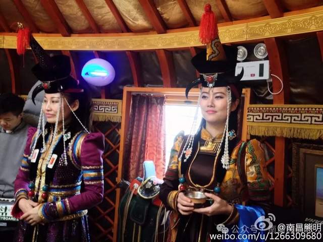 穿着蒙古民族盛装的帅哥、美女逐渐汇拢,款款而来,进帐篷为客人献上蓝色哈达,并献酒。
