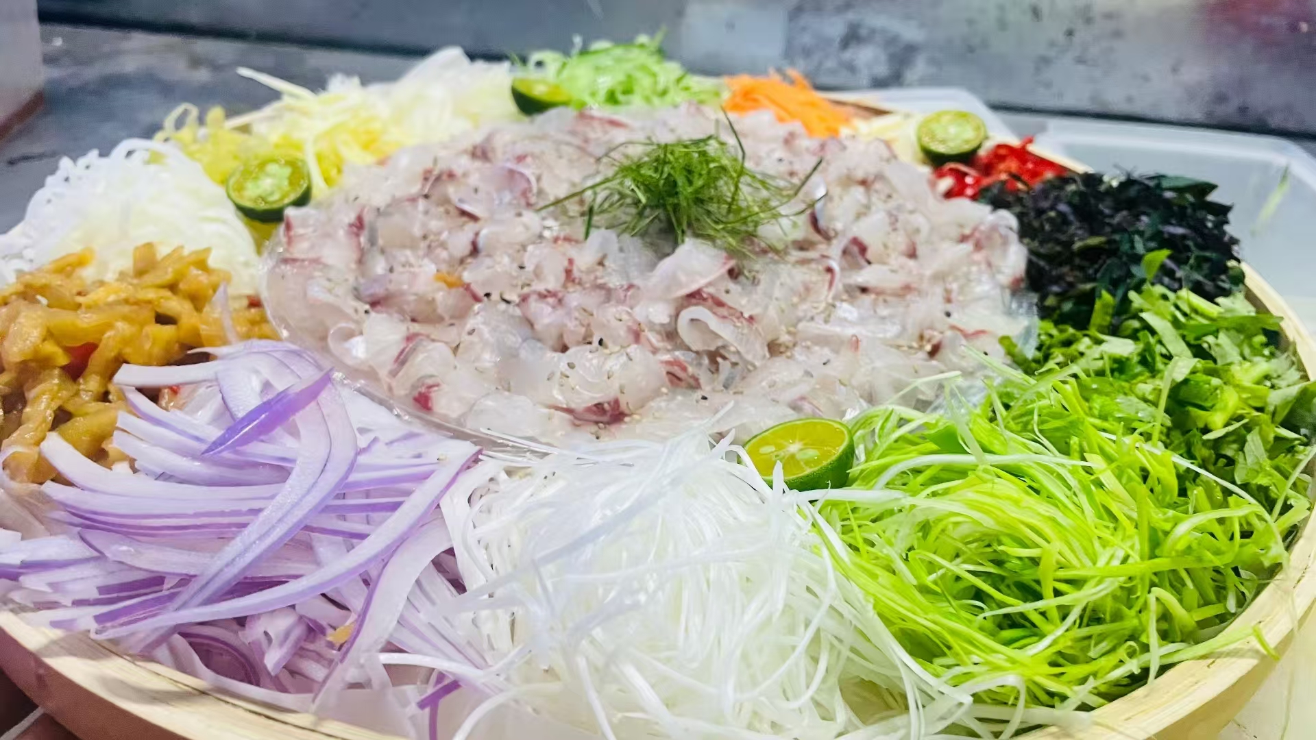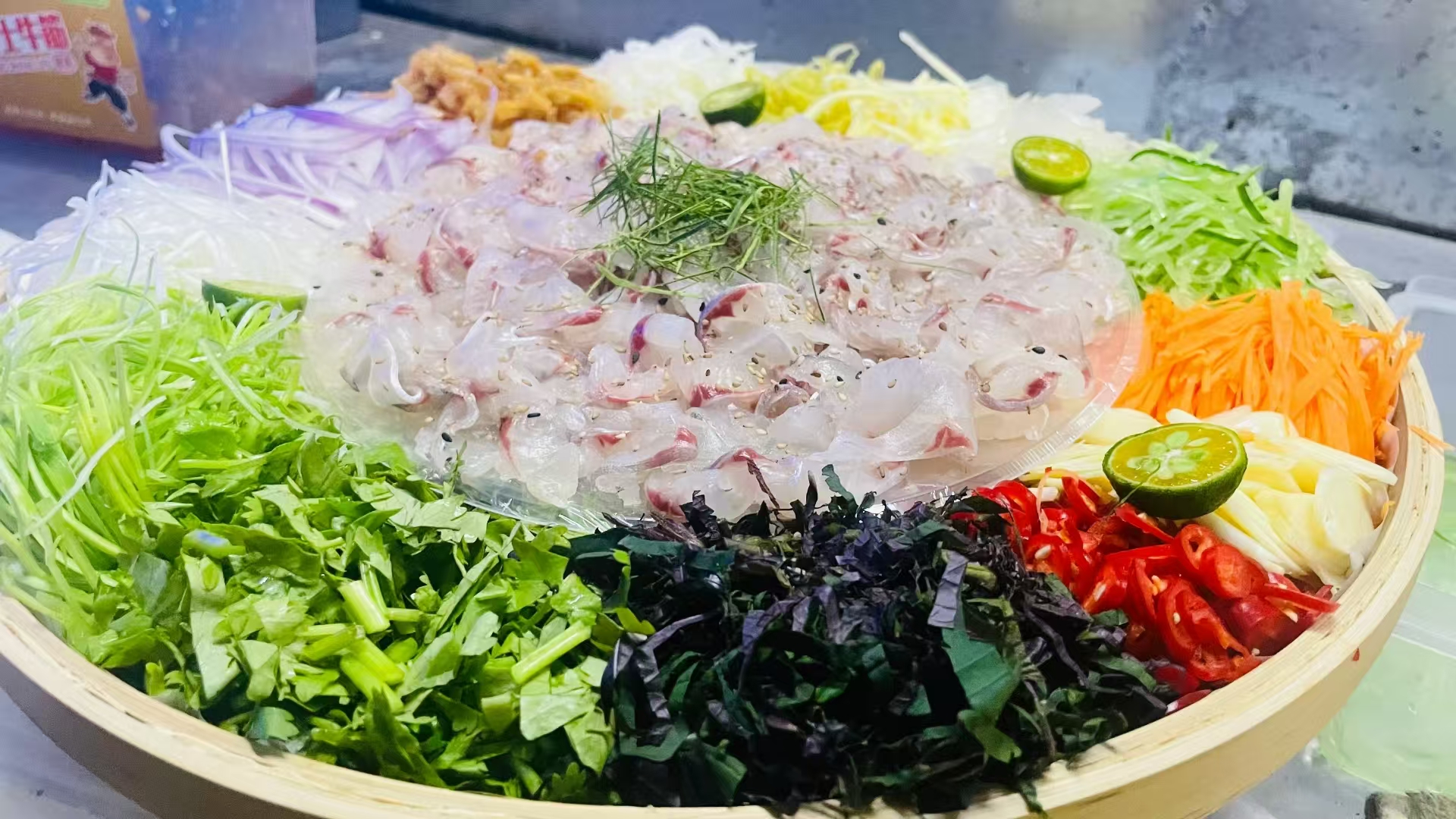 配菜的搭配,则是凌云鱼生的点睛之笔,看似简单却暗藏巧思。新鲜的香菜切段,带着独特的辛香;脆嫩的萝卜丝切得纤细均匀,透着清甜;柠檬切片,酸香清爽;紫苏叶切丝,香气醇厚独特;小米辣切碎,辣得劲爽;洋葱切丝,带着微辛的甜润;还有脆嫩的豆芽,口感脆嫩多汁。十余种配菜色彩斑斓,错落摆盘,不仅视觉上赏心悦目,更在风味上形成层次丰富的呼应,等待着与鱼肉碰撞出奇妙的味觉火花。