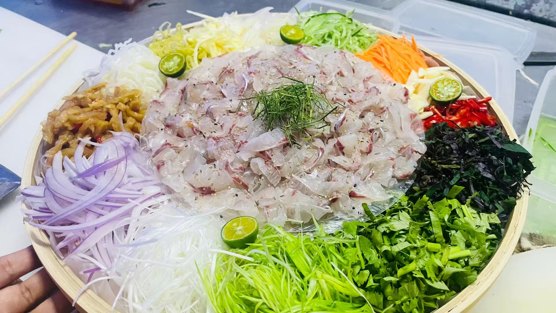 凌云鱼生的精髓,首在食材的本真。鱼,必选浩坤湖滋养的鲤鱼或罗非鱼。浩坤湖水质清冽,水草丰美,生长于此的鱼肉质紧实、鲜嫩无腥,是鱼生的绝佳选材。渔民清晨捕捞,鲜活的鱼即刻送至后厨,趁其生命力最旺盛之时处理,才能最大程度锁住鱼肉的鲜甜。而清洗鱼肉的水,更是大有讲究,必须取用凌云本地的天然活泉水。泉水甘冽澄澈,富含矿物质,不仅能洗净鱼肉表面的杂质,更能带走一丝土腥,让鱼肉的本味愈发纯粹。洗净后的鱼肉需轻轻沥干水分,不疾不徐,只为保留肉质的湿润与弹嫩。