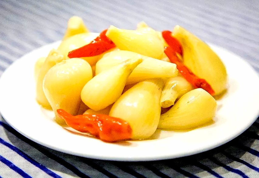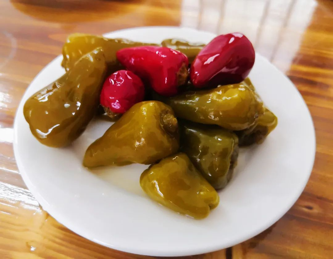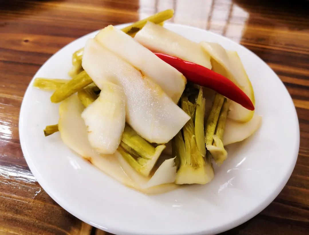 家乡的浸坛泡菜很少是用来下饭的,多数是用来佐茶的。春节喝茶待客时,母亲会端上各种小吃,自然是离不开那些开胃的泡菜。最开胃的当属酒娘泡芥菜头(俗称:寒老),咬上一口,浓郁辣味能从鼻孔里窜出,又辣又麻的过电感能让人潸然泪下,其余韵又催着人吃下第二口。除了佐茶,浸坛泡菜也能炒菜,将浸泡好的辣椒捞出来,切成片,炒鸭杂、猪皮、牛肉,大肠,美味可口让人无法放下筷子。
