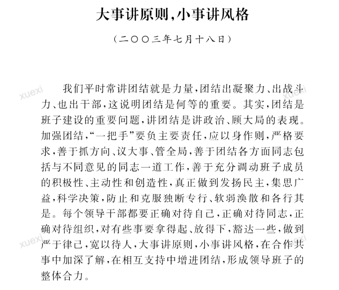 总之,“大事讲原则,小事讲风格”这一历久弥新的领导智慧,对于当前加强领导班子建设仍然具有重要指导意义。各级领导干部应当深入领会其精神实质,将其转化为推动工作的实际能力,不断凝聚班子的整体合力,为以中国式现代化全面推进强国建设、民族复兴伟业提供坚强组织保证。