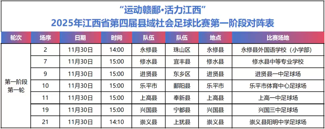 11月30日,江西第四届县域社会足球联赛战幕拉开。44支球队,865名球员,从赣北永修到赣南兴国,从赣东乐平到赣西崇义,七大赛场同时开火,一场草根足球的盛宴在全省范围内火热上演。这不是一场简单的体育赛事。这是江西县域力量的集体展示,是乡村振兴的生动实践,更是全民健身国家战略的基层答卷。