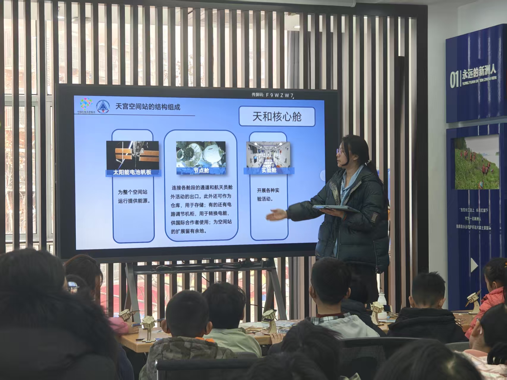 紧接着的“空间站概述与天宫系列”课程,则带领孩子们“飞向太空”。志愿者从空间站的定义与功能讲起,详细介绍了“天宫”空间站的“天和”核心舱、“问天”实验舱等结构组成,以及航天员在站内如何生活、如何进行科学实验。通过视频展示中国航天员在轨工作的真实画面,孩子们对“太空家园”有了更具体的想象。课堂互动环节,孩子们争相提问:“空间站的水从哪里来?”“在太空怎么睡觉?”讲师一一耐心解答,课堂气氛热烈而有序。