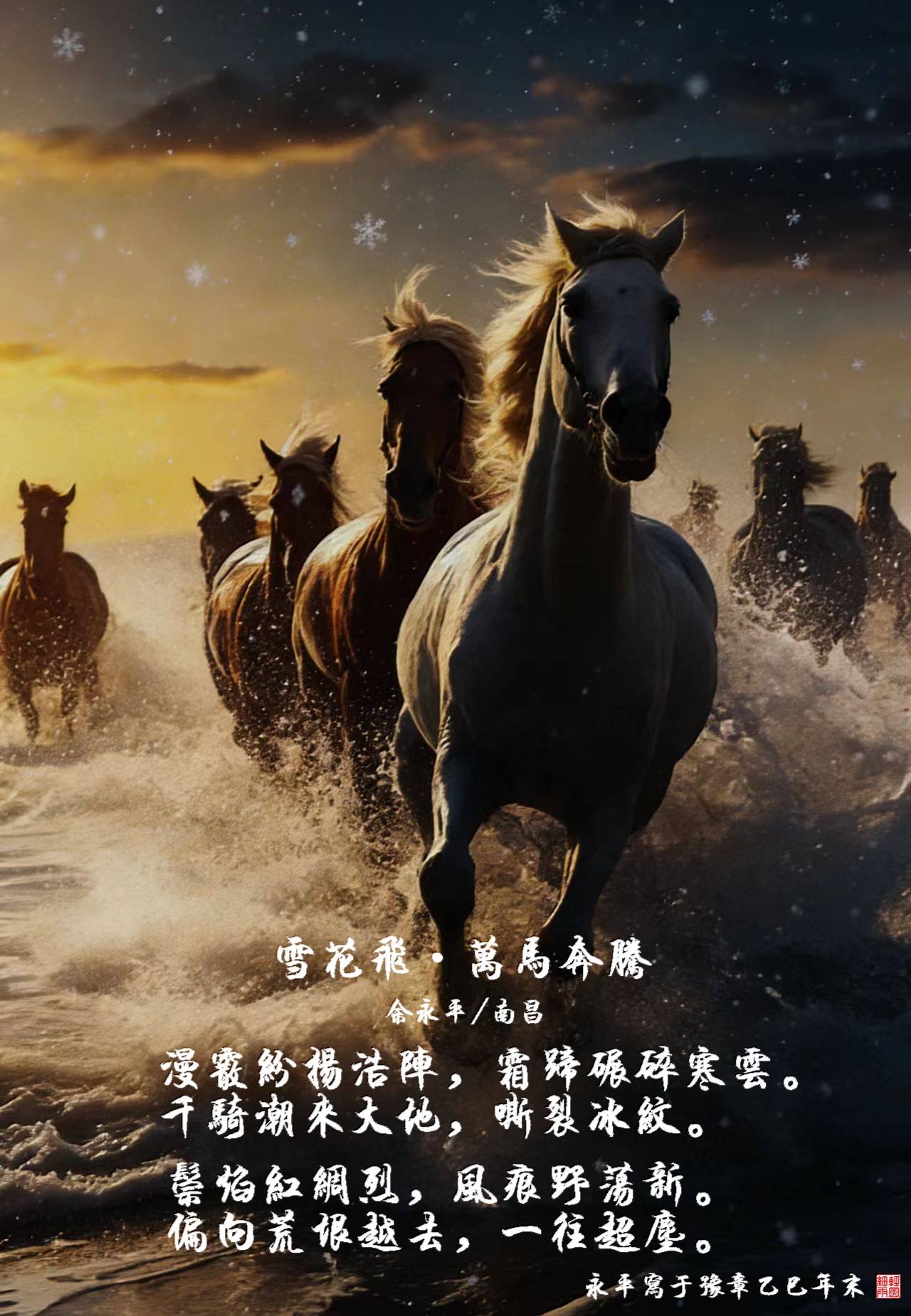 雪花飞·万马奔腾 作者余永平2026-02-01 08:29 阅读 余永平关注公号雪花飞·万马奔腾余永平/南昌漫霰纷扬浩阵,霜蹄碾碎寒云。千骑潮来大地,嘶裂冰纹。鬃焰红绸烈,风痕野荡新。偏向荒垠越去,一往超尘。2026.01.31打开APP阅读全文 特别声明以上内容(包括但不限于文字、图片、视频)为大江新闻用户上传并发布,仅代表该作者观点,内容均由作者自负版权等法律责任,大江新闻客户端仅提供信息发布平台。