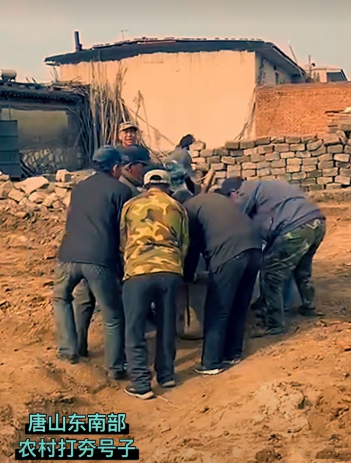 打夯号子。在唐山地域的传统建筑场景中,打夯号子多用于房屋地基等建筑基础的夯实工序。记忆的画面,与眼前泛黄的影像严丝合缝。需由四至八名有力气的汉子合力操控,多是叔伯辈的,穿着辨不出本色的褂子,挽着裤腿,露着黢黑精瘦的小腿肚子。他们围着一盘石夯(石磙),那石夯青灰色,凭借木杠或绳索抬升夯石,再令其反复砸击地面,夯实土层。夯顶有时会插一柄褪色的红旗,这一劳作过程自带庄重的仪式感,奠基之日往往要择取良辰吉日,既寄寓对建筑稳固的期许,也暗含对生活安宁的祈愿。