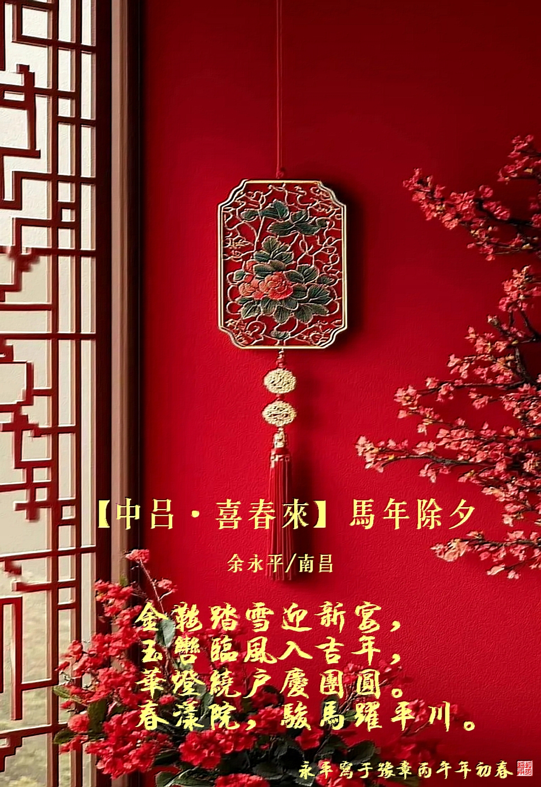 【中吕•喜春来】马年除夕 作者: 余永平2026-02-08 10:12 阅读 余永平关注公号【中吕•喜春来】马年除夕余永平/南昌金鞍踏雪迎新宴,玉辔临风入吉年,华灯绕户庆团圆。春漾院,骏马跃平川。永平写于豫章丙午年初春打开APP阅读全文 特别声明以上内容(包括但不限于文字、图片、视频)为大江新闻用户上传并发布,仅代表该作者观点,内容均由作者自负版权等法律责任,大江新闻客户端仅提供信息发布平台。