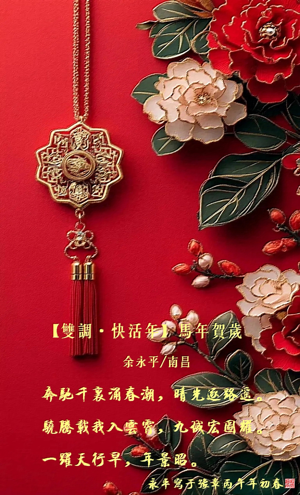 【双调•快活年】马年贺岁 作者: 余永平2026-02-08 10:16 阅读 余永平关注公号【双调•快活年】马年贺岁余永平/南昌奔驰千里涌春潮,晴光逐路遥。骁腾载我入云霄,九域宏图耀。一跃天行早,年景昭。永平写于豫章丙午年初春打开APP阅读全文 特别声明以上内容(包括但不限于文字、图片、视频)为大江新闻用户上传并发布,仅代表该作者观点,内容均由作者自负版权等法律责任,大江新闻客户端仅提供信息发布平台。
