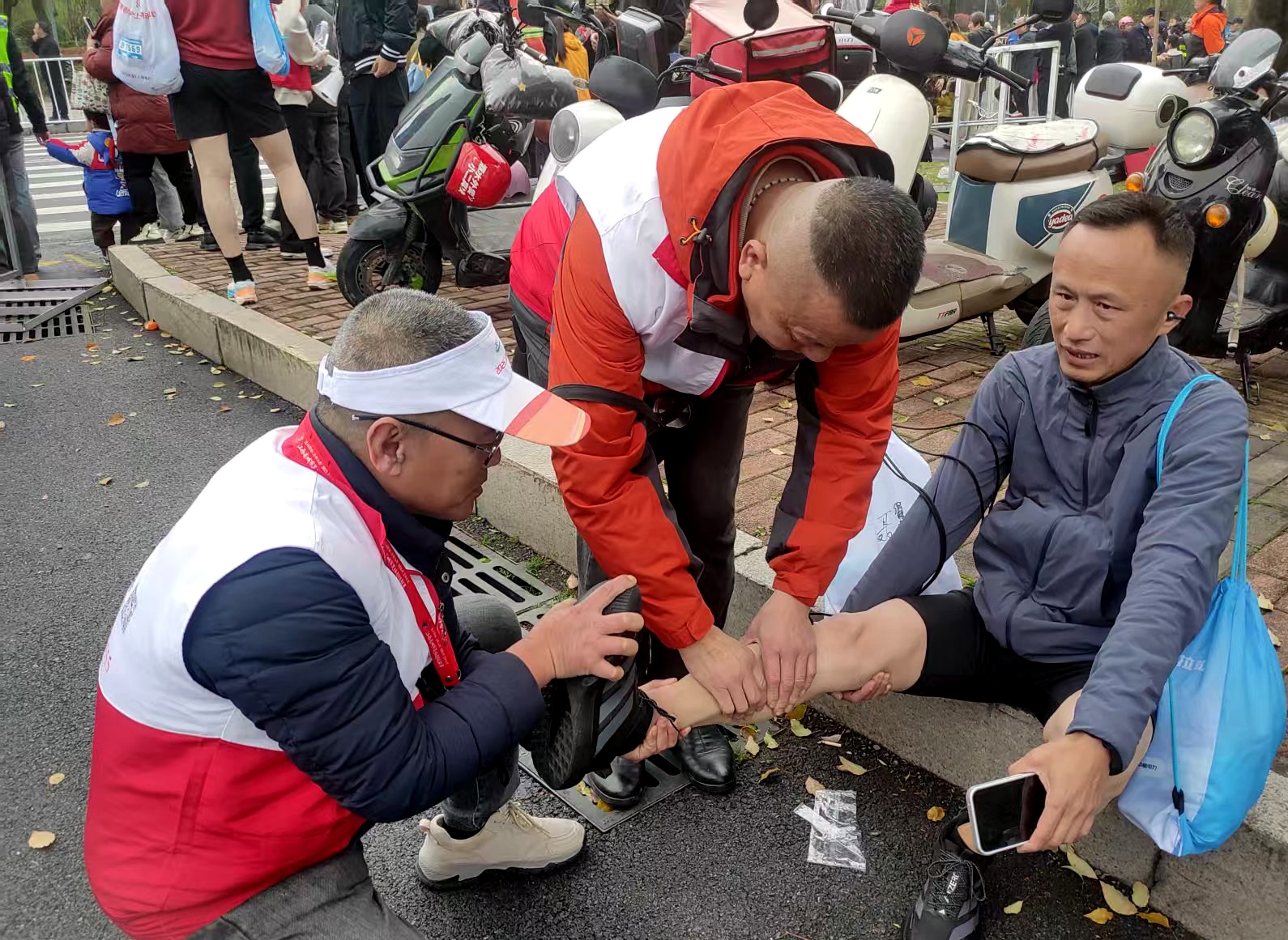 赛事现场,有跑者出现腿脚抽筋,协会会长朱海庆凭借专业救护知识,立即为其实施护理,快速缓解筋络,帮助跑者恢复行走,用暖心行动守护每一位参赛者。医疗救护点成为选手们的“能量加油站”。