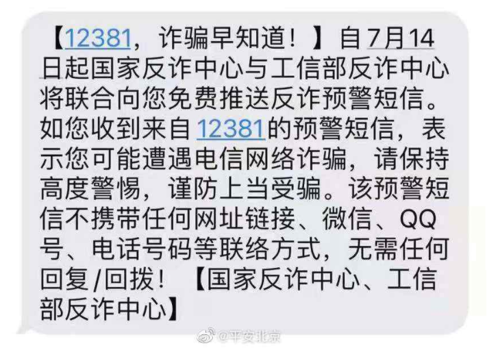 自明日(7月14日)起国家反诈中心与工信部反诈中心将联合向您免费推送反诈预警短信。如您收到来自12381的预警短信,表示您可能遭遇电信网络诈骗,请保持高度警惕,谨防上当受骗。该预警短信不携带任何网址链接、微信、QQ号、电话号码等联络方式,无需任何回复/回拨!