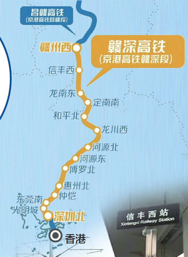 京港高铁赣深段北起江西省赣州市,南至广东省深圳市,线路全长434公里,设计时速350公里,全线共设赣州西、信丰西、龙南东、定南南、和平北、龙川西、河源北、河源东、博罗北、惠州北、仲恺、东莞南、光明城13座车站,其中赣州西站、光明城站为既有车站。
