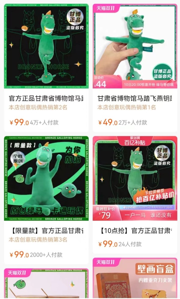 据悉,在轰轰烈烈的双十一预售中,甘肃博物馆绿马系列已备货近10万件,记者在某购物平台上看到,该旗舰店已上新萌鸟先飞拖鞋、绿马毛绒包、绿马徽章等多种文创产品。