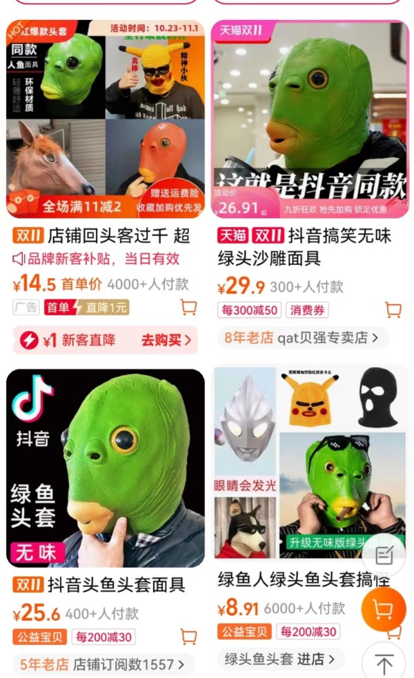 就是这样一款丑出天际的头套,在当时,实实在在的火了一把,购物平台上售卖绿鱼头头套的商家如雨后春笋,售价在15元到30元之间,还有个别卖到了50块钱以上。