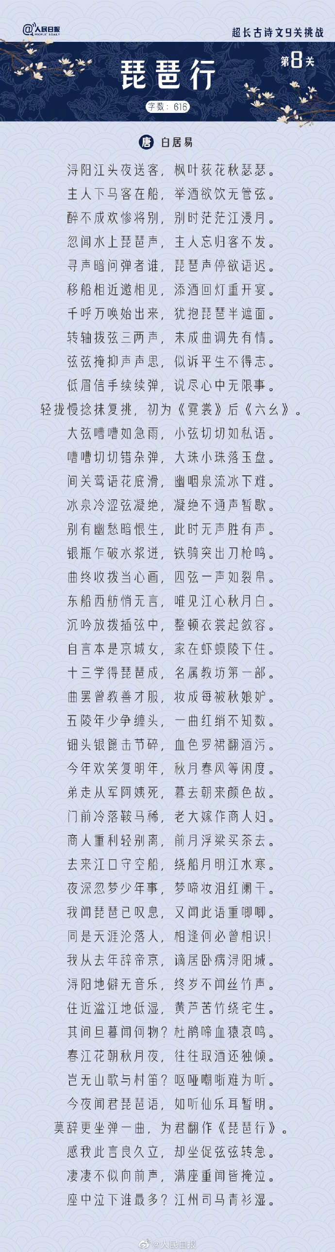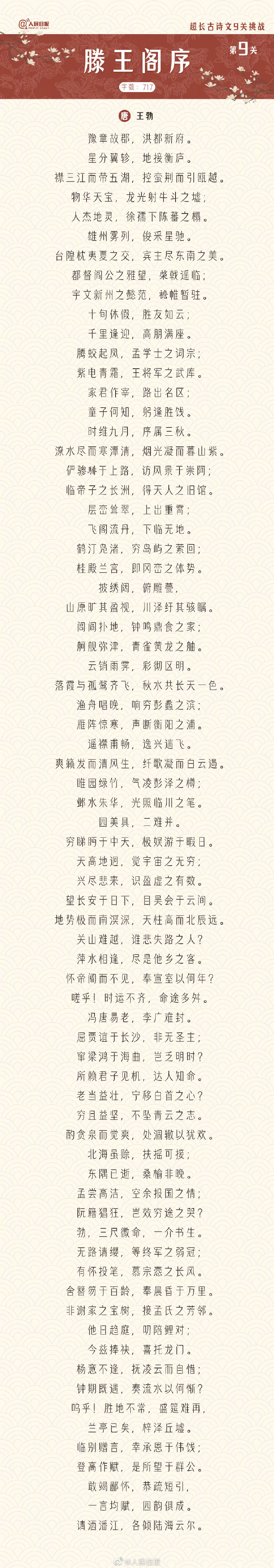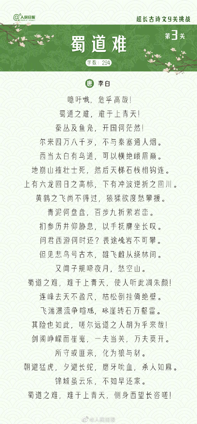 这个春节假期,岳飞庙、剑门关等景区推出“背诵古诗文免费游景区”等活动,不少游客下场挑战。294字的《蜀道难》,330字的《木兰辞》,616字的《琵琶行》。网友:儿时总有些意想不到的高光时刻,比如你曾全文背诵过717字的滕王阁序!9首古诗文↓快挑战!