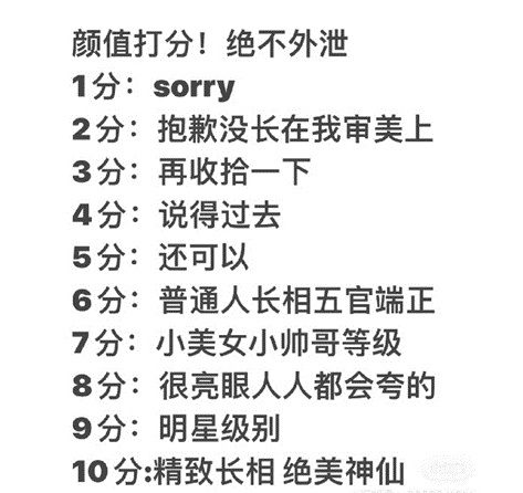 ——“很多女生想知道,自己在男生的眼中是不是很漂亮,今天我给你提供一份女生颜值打分表,你可以好好对照了解一下哦。”