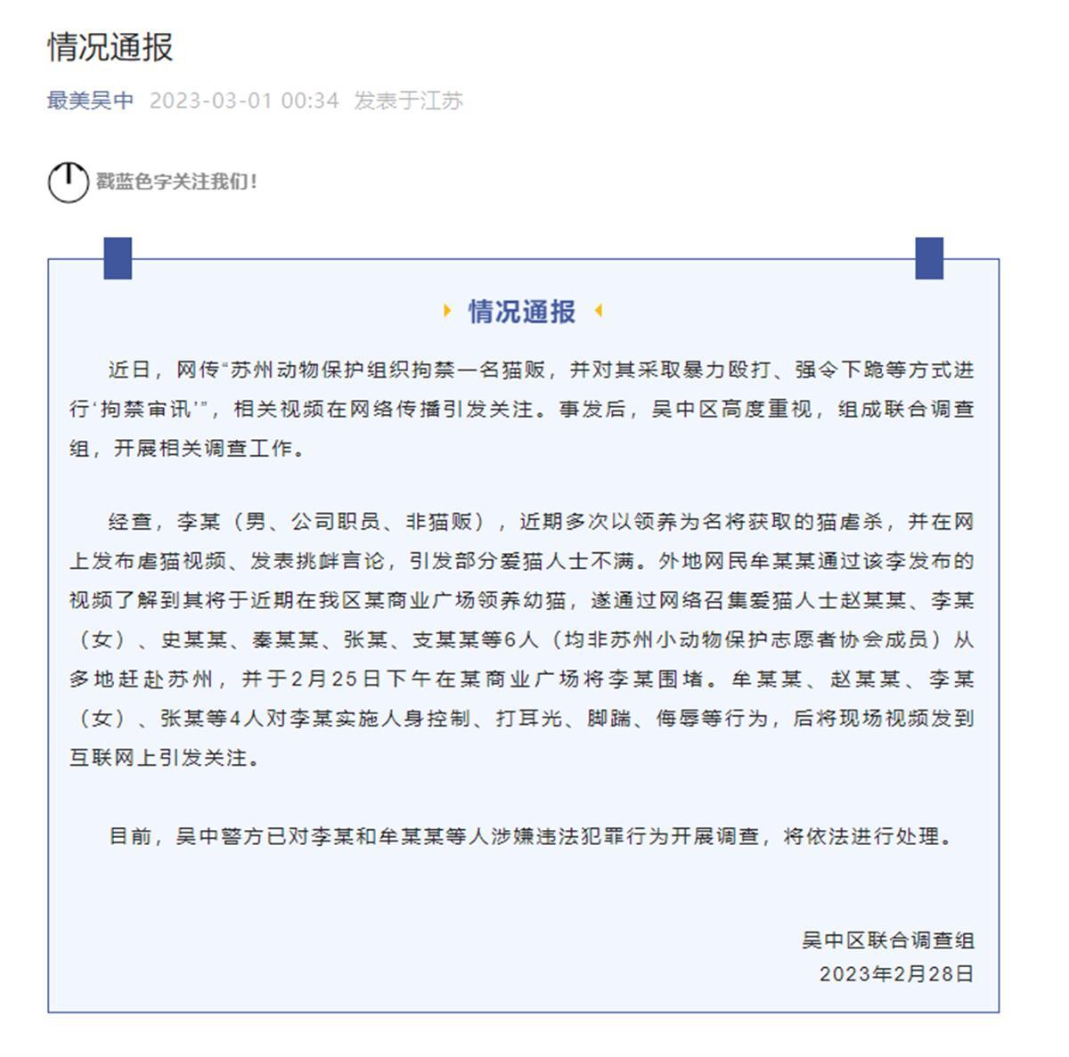 据官方调查结果,李某(男、公司职员、非猫贩),近期多次以领养为名将获取的猫虐杀,并在网上发布虐猫视频、发表挑衅言论,引发部分爱猫人士不满。网民牟某某通过网络召集爱猫人士赵某某、李某、史某某等6人,于2月25日下午在某商业广场将李某围堵,对其实施了人身控制、打耳光、脚踹、侮辱等行为,之后将现场视频发到互联网上引发关注。
