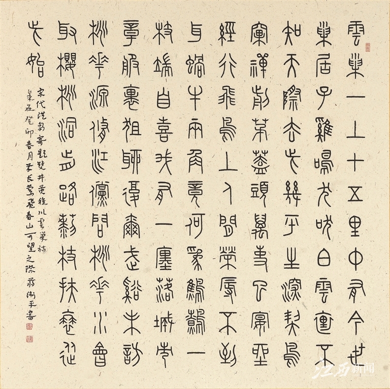 ▲篆书 《洪刍·寄题双井黄稚川云巢》 释文:云巢一上十五里,中有今世巢居子。鸡鸣犬吠白云里,不知天际去此几。平生深契鸟窠禅,剪茅盖头万事已。宴坐经行飞鸟上,人间荣辱不到耳。蜗牛两角竟何为,鹪鹩一枝端自喜。我有一廛落城市,章服裹狙聊复尔。武溪未访桃花源,修江傥问桃花水。会取樱桃洞前路,藜杖扶衰从此始。蒋卫平书