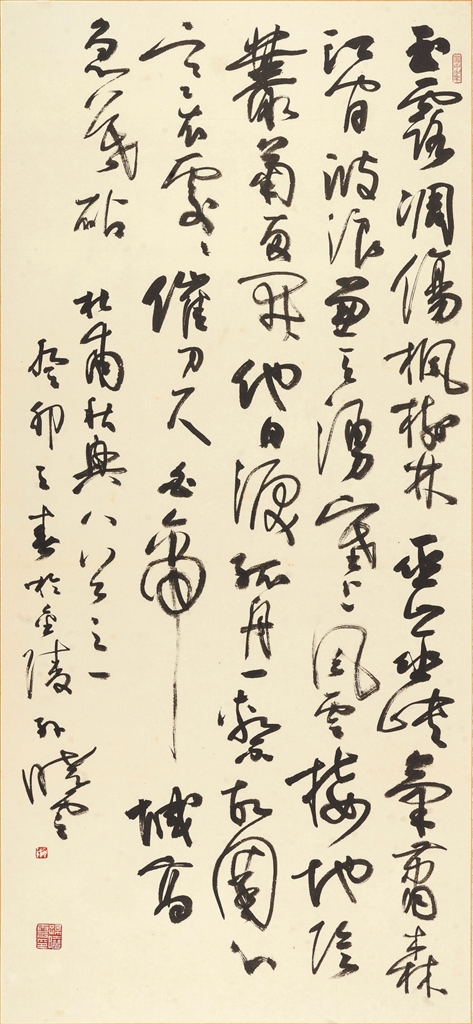 ▲行草 《杜甫·秋兴八首(其一)》 释文:玉露凋伤枫树林,巫山巫峡气萧森。江间波浪兼天涌,塞上风云接地阴。丛菊两开他日泪,孤舟一系故园心。寒衣处处催刀尺,白帝城高急暮砧。孙晓云书