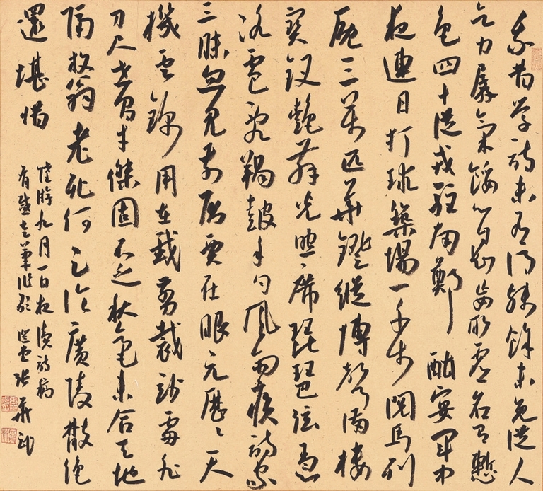 ▲行书 《陆游·九月一日夜读诗稿有感走笔作歌》 释文:我昔学诗未有得,残余未免从人乞。力孱气馁心自知,妄取虚名有惭色。四十从戎驻南郑,酣宴军中夜连日。打球筑场一千步,阅马列厩三万匹。华灯纵博声满楼,宝钗艳舞光照席。琵琶弦急冰雹乱,羯鼓手匀风雨疾。诗家三昧忽见前,屈贾在眼元历历。天机云锦用在我,剪裁妙处非刀尺。世间才杰固不乏,秋毫未合天地隔。放翁老死何足论,广陵散绝还堪惜。张华武书