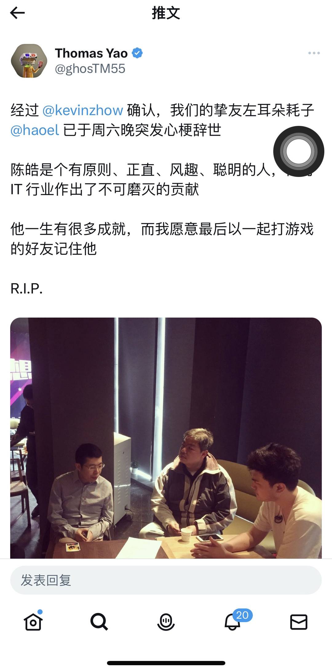 “Thomas Yao”在社交平台发文悼念陈皓。