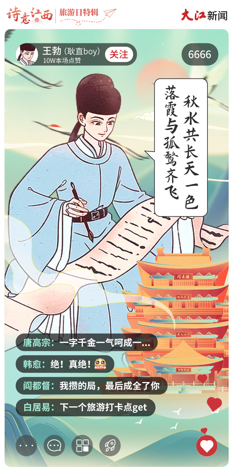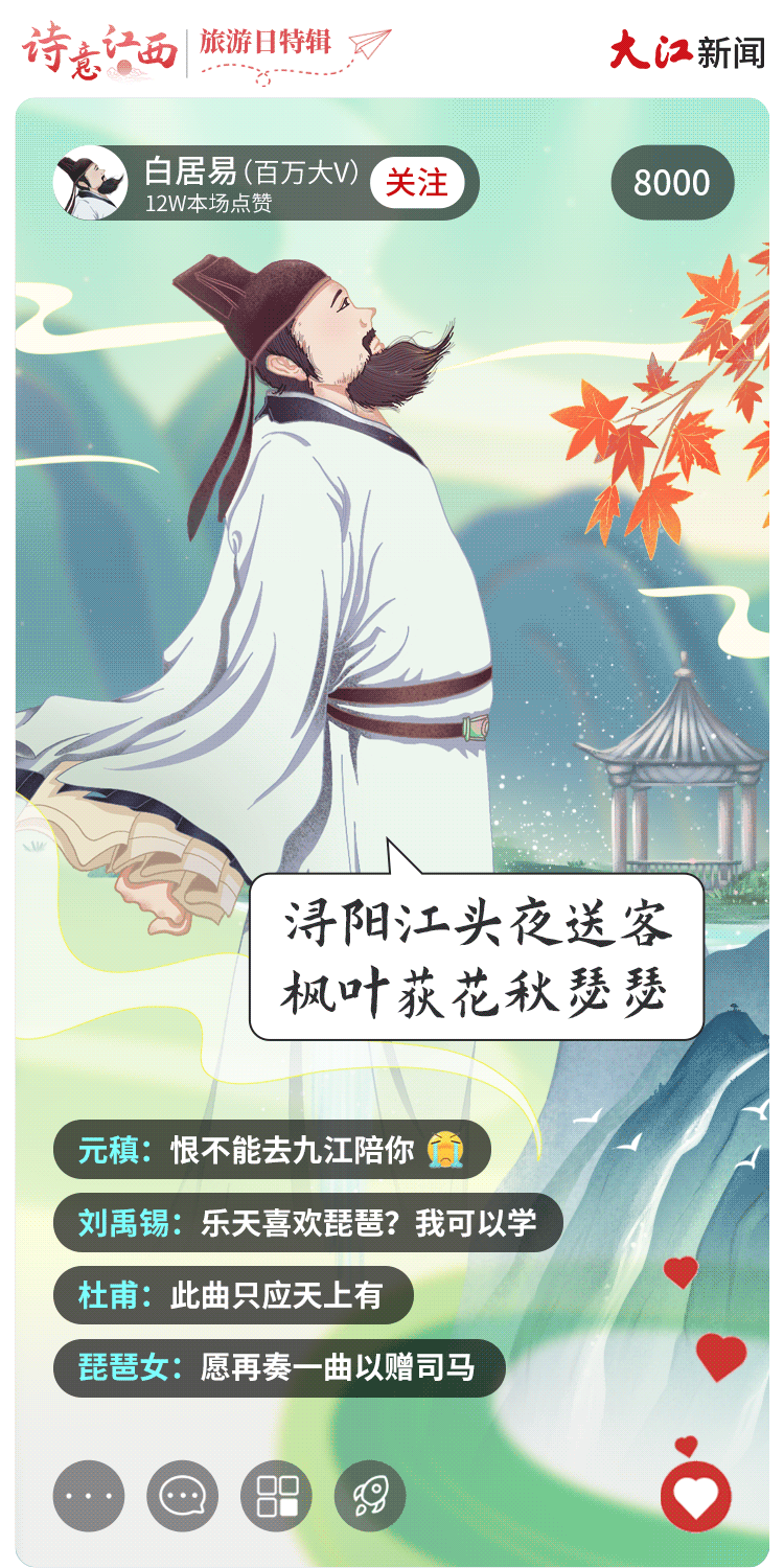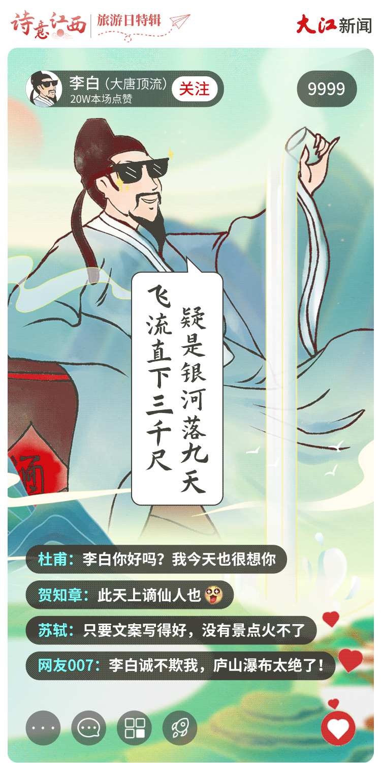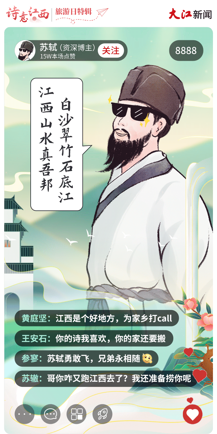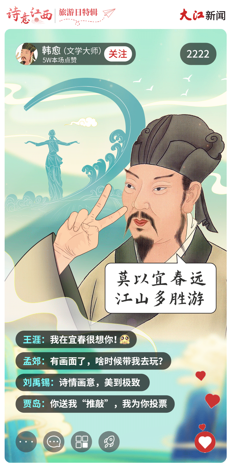 大美江西,文脉悠长,这里涌现出了大批文化巨擘,更有不少古代诗词名人“到此一游”留下墨宝。如果请他们用诗词为江西文旅代言直播,你会pick哪位呢?