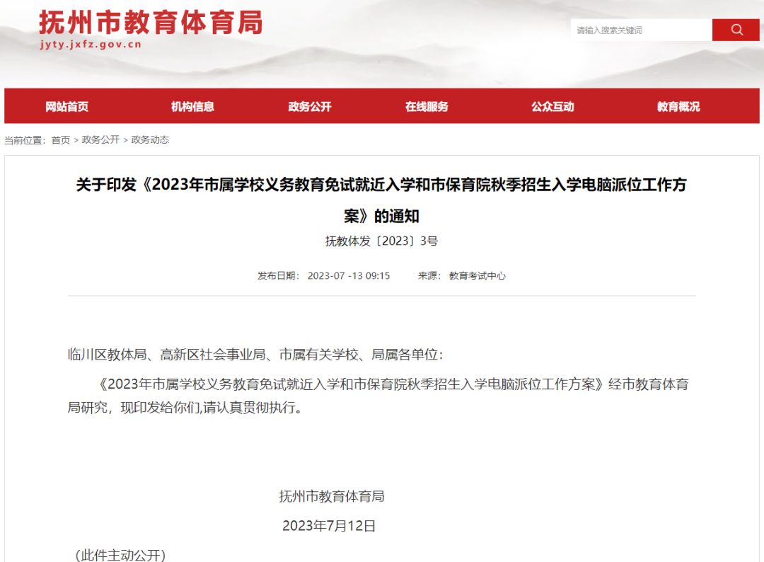 免试就近入学!抚州市教体局发布重要通知2023-07-13 19:58 阅读 抚州市融媒体中心 7月12日 抚州市教育体育局 发布重要通知 2023年市属学校义务教育免试就近入学和市保育院秋季招生入学电脑派位工作方案 根据江西省教育厅《江西省教育厅关于做好2023年全省普通中小学招生入学工作的通知》(赣教基字〔2023〕12号)《抚州市人民政府办公室关于进一步做好严禁市属公办学校非政策性择校工作的通知》(抚府办发〔2018〕60号)精神和《关于印发〈2023年临川教育集团公办学校义务教育免试就近入学实施方案〉的通知》(抚教体发〔2023〕1号)《关于印发<抚州市保育院2023年秋季招生工作实施方案>的通知》(抚教体基字〔2023〕32号)要求,为认真做好2023年市属学校义务教育免试就近入学和市保育院秋季招生入学电脑派位工作,阳光操作,规范流程,确保电脑派位工作公平公正公开,切实取信于民,促进教育公平,特制定本方案: 一、派位原则 (一)公平公正公开。全面实行透明阳光操作,规范电脑派位工作流程,确保派位工作公平公正公开。 (二)分校按计划进行。抚州一中、临川一中、临川二中派位计划数按照各生源学校填报志愿情况,按比例分配至各生源学校,分生源学校产生电脑派位录取学生名单;临川一中高新校区、市属民办学校和市保育院根据派位计划数在对应报名学生(幼儿)中分招生学校产生电脑派位录取名单。 (三)第三方独立操作。聘请具有专业资质的电脑摇号公司开发派位软件并独立操作。 (四)各方代表监督实施。邀请党代表、人大代表、政协委员、纪检监察人员、家长代表、新闻媒体记者等相关人员到直播现场参与监督派位全过程。 (五)司法公证部门全程公证。邀请民正公证处对派位过程进行现场监督公证,确保派位工作的真实性、合法性、有效性。 二、派位计划 (一)市属公办集团学校派位计划数共1032个 1.抚州一中初中一年级免试就近入学招生计划600个,其中就近划片入学351个,电脑派位计划数249个; 2.临川一中初中一年级免试就近入学招生计划600个,其中就近划片入学624个,招生计划已招满,不再派位; 3.临川二中初中一年级免试就近入学招生计划600个,其中就近划片入学417个,电脑派位计划数183个; 4.临川一中高新校区初中一年级电脑派位计划数为招生计划数600个。 (二)市属民办学校派位计划共1100个 1.临川中阳学校初中一年级电脑派位计划数500个; 2.临川中阳初级中学初中一年级电脑派位计划数600个。 (三)市保育院派位计划618个 1.和园(老园区)电脑派位计划数150个; 2.悦园(新园区)电脑派位计划数250个; 3.锦园(景泰·凯旋城幼儿园)电脑派位计划数35个; 4.愉园(新力水投·愉景湾幼儿园)电脑派位计划数35个; 5.碧园(碧桂园·临川府幼儿园)电脑派位计划数35个; 6.美园(东润·学墅壹号幼儿园)电脑派位计划数52个; 7.曜园(碧桂园·天曜幼儿园)电脑派位计划数61个(曜园小班现场抽签名额剩余9个,为回应群众关切,特用于电脑派位,派位计划数由52个增加至61个) 三、派位资格 (一)抚州一中、临川二中 1.抚州一中对口生源学校:临川区实验小学、临川三小、临川四小、临川八小、临川九小、临川十小、临川十一小、临川十二小、临川十三小、临川十五小、伟星小学、名仕小学、临川中阳学校、临川区第四实验学校; 2.临川二中对口生源学校:临川一小、临川二小、临川五小、临川七小、临川十六小、临川十七小、上顿渡镇中心小学、临川区第一实验学校。 (二)临川一中高新校区 按照就近优先兼顾公平原则,派位资格分为两类。 第一类:具有市中心城区城南片区(迎宾大道以南)户籍,且法定监护人或学生本人在城南片区购房的小学应届毕业生(不含城区九年一贯制学校毕业生)。认定材料:户口簿(户籍所在地为长岭派出所、城西派出所、崇岗派出所),不动产权证或房产证(或经房管部门备案的购房合同、购房发票)。 第二类:具有市中心城区户籍的小学应届毕业生(不含城区九年一贯制学校毕业生)。认定材料:户口簿(户籍所在地为文昌派出所、六水桥派出所、西大街派出所、青云派出所、荆公路派出所、长岭派出所、城西派出所、崇岗派出所)。 以上户籍迁入和购房时间截止至2023年6月30日。 (三)临川中阳学校、临川中阳初级中学 具有抚州市户籍或学籍的小学应届毕业生。 (四)抚州市保育院 1.和园(老园区): 出生日期为2019年9月1日至2020年8月31日,户籍所在地为文昌派出所、六水桥派出所、西大街派出所、青云派出所、荆公路派出所; 2.悦园(新园区)、锦园(景泰·凯旋城幼儿园)、愉园(新力水投·愉景湾幼儿园)、碧园(碧桂园·临川府幼儿园): 出生日期为2019年9月1日至2020年8月31日,户籍所在地为文昌派出所、六水桥派出所、西大街派出所、青云派出所、荆公路派出所、长岭派出所、城西派出所; 3.美园(东润·学墅壹号幼儿园)、曜园(碧桂园·天曜幼儿园): 出生日期为2019年9月1日至2020年8月31日,户籍所在地为文昌派出所、六水桥派出所、西大街派出所、青云派出所、荆公路派出所、长岭派出所、城西派出所、崇岗派出所。 以上幼儿户籍迁入截止时间为2023年6月30日。 四、派位办法 (一)已拟录取市属公办学校及临川区、高新区九年一贯制学校直升小学应届毕业生和已现场抽签拟录取市保育院的幼儿不再参加电脑派位; (二)临川一中高新校区电脑派位对第