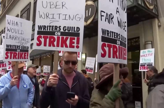 一支由演员和编剧集结成的“复仇者联盟”正式成立。随之,美国好莱坞影视工业开始全面停摆。在华纳兄弟、迪士尼等美国影视娱乐产业巨头总部门前,有成百上千的人高举“罢工”标语牌游行示威。