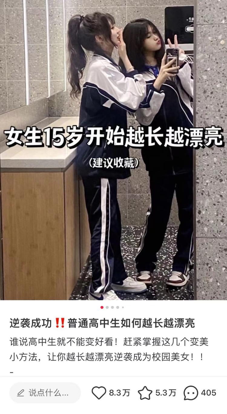 网络平台上,对女生外在的内卷已经下至十几岁的学生。“逆袭成功!!女生15岁开始越长越漂亮”“如何成为全班最受欢迎的女生(建议收藏)”的内容比比皆是,配图多是一群穿着校服的女孩子,有着与年龄不相符的精致的妆容发型,美则美矣,却缺少了一些什么。