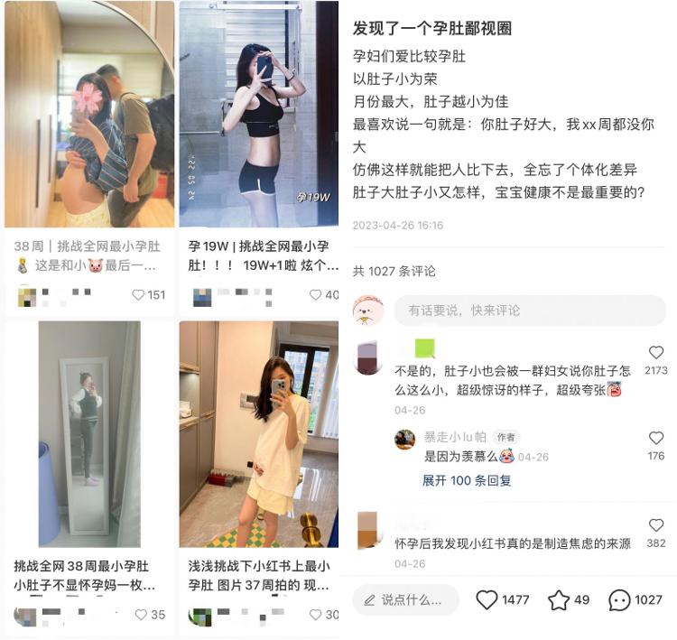 还有网友表示有孕肚鄙视圈,孕妇之间爱比肚子且以肚子小为荣,评论区也经常看到回复:“你肚子好大,我xx周都没你大。”“挑战全网最小孕肚”的帖子更是层出不穷。