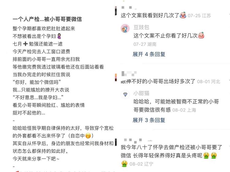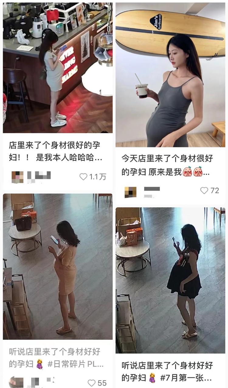 张女士怀孕后经常上网搜索经验贴、孕期好物,打开app全是一些挺着大肚子穿着紧身衣的精美自拍照。还有一帮人发着相同的文案:“听说店里来了个身材很好的孕妇,原来是我。”配图多是穿着超短裙,大秀特秀自己的美腿身材。