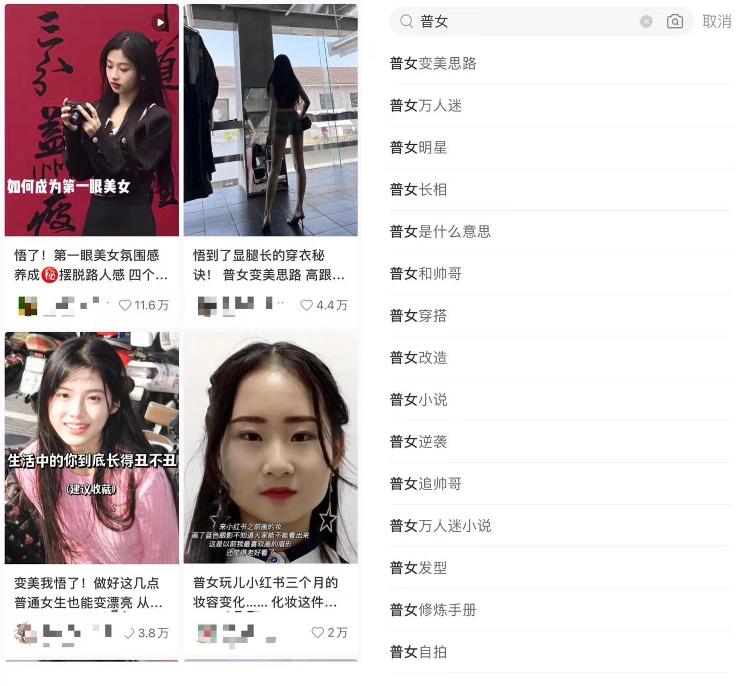 同时,在铺天盖地的变美分享中,有一个词出现频率非常高——“普女”,普女变美思路、普女逆袭、给普女的人生建议、普女如何择偶……有“普女”在网上发表疑惑:“网络上面人均大美女,自律自信美丽身材也很好,感觉越来越焦虑觉得自己好没有用怎么办?”人人都想变美,冷白皮、巴掌脸、A4腰、BM风就是美吗?不知何时,普女也成为了一种标签,什么样的女生才算普女?普女就应该被他人指导自己的人生吗?