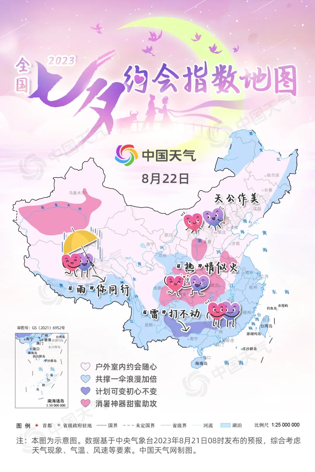 又是一年七夕到! 明天(8月22日)农历七月初七,正是我国最具浪漫色彩的传统节日——七夕节,也被称为中国的情人节。你是否要去赴一场浪漫的约会呢?今年七夕,我国北方大部天公作美,部分地区会有雨水或高温来扰。中国天气网推出全国七夕约会指数地图,看看你的七夕将是“雷”打不动还是非你莫“暑”。