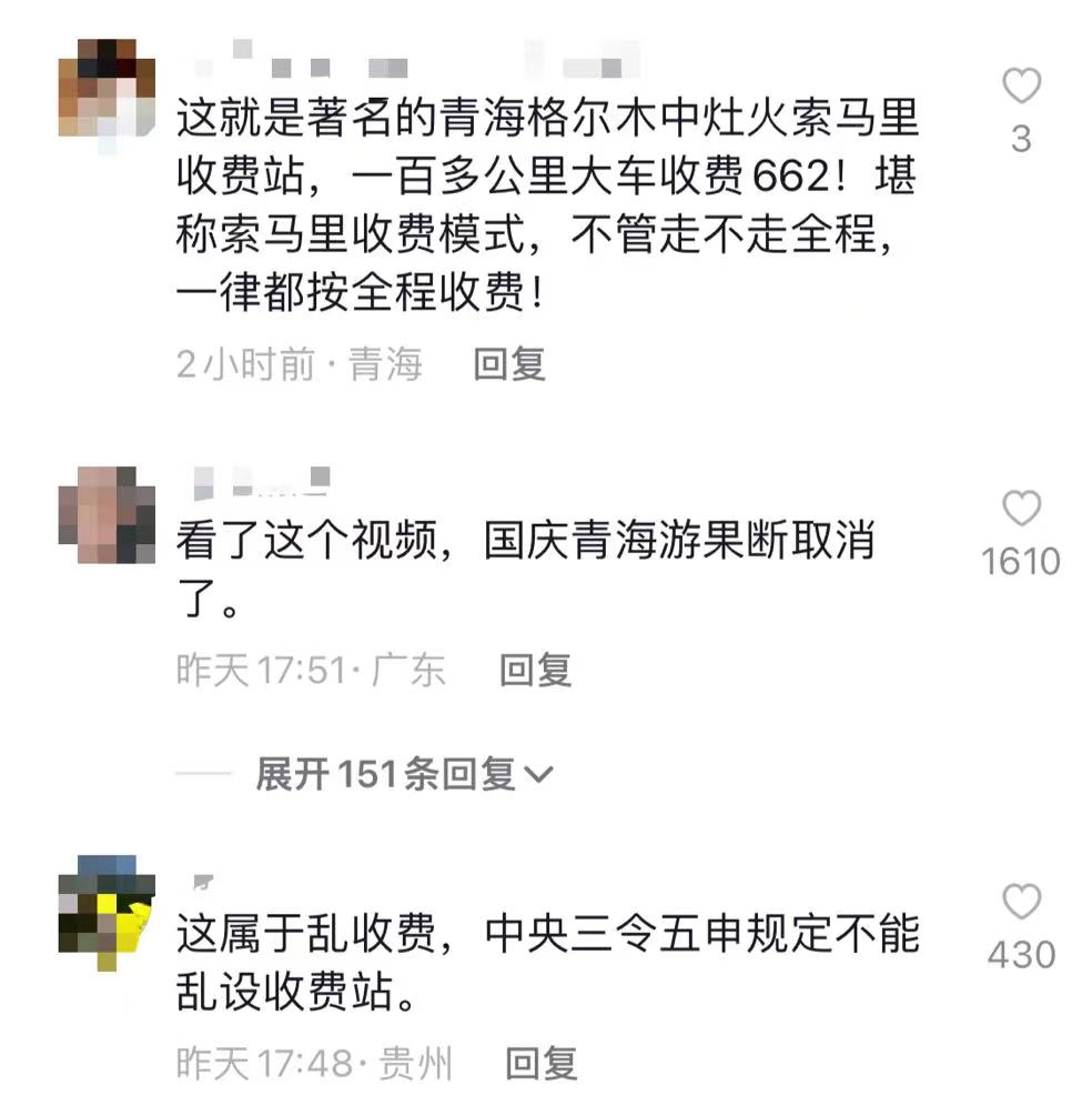 相关视频引发网友热议。有网友留言:“不管走多远,都按全程收费,这个收费标准是否合理?上路收费要提前告知,让人知道,不能这样‘埋伏式’收费。”也有网友表示:“看过这个视频后,国庆青海游果断取消了。”