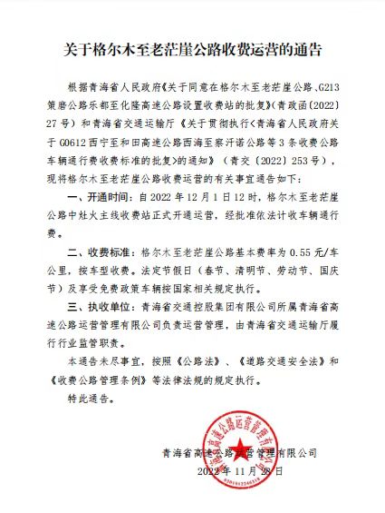 记者查询了解到,2022年11月28日,青海省高速公路运营管理有限公司曾发布通告称,根据青海省人民政府及相关部门发布的文件,自2022年12月1日12时起,格尔木至老茫崖公路中灶火主线收费站正式开通运营,经批准依法计收车辆通行费。