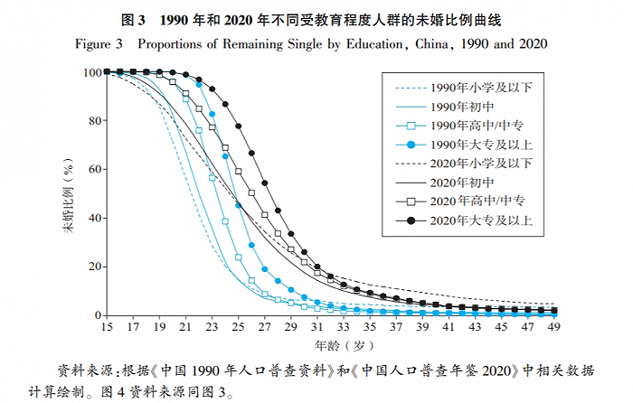 论文称,引入性别视角后,考察教育对男性和女性初婚推迟影响的差异发现,1990年,在女性人口中,大专及以上女性的未婚比例几乎在所有年龄上都高于小学及以下女性,但在40岁以后,二者差异很小,即终身不婚的比例几乎不存在差异,这反映出高等教育虽然会推迟女性初婚时间,但对女性终身结婚与否的影响并不显著;在男性人口中,受教育程度为大专及以上和小学及以下的男性的未婚比例曲线之间存在较大差异,在26岁及以下年龄段,大专及以上男性的未婚比例高于小学及以下男性,但在26岁以上年龄段,小学及以下男性的未婚比例明显更高,这表明高等教育虽然会推迟男性初婚时间,但从终身角度来看会增加男性的婚配优势进而提高其结婚的可能性。