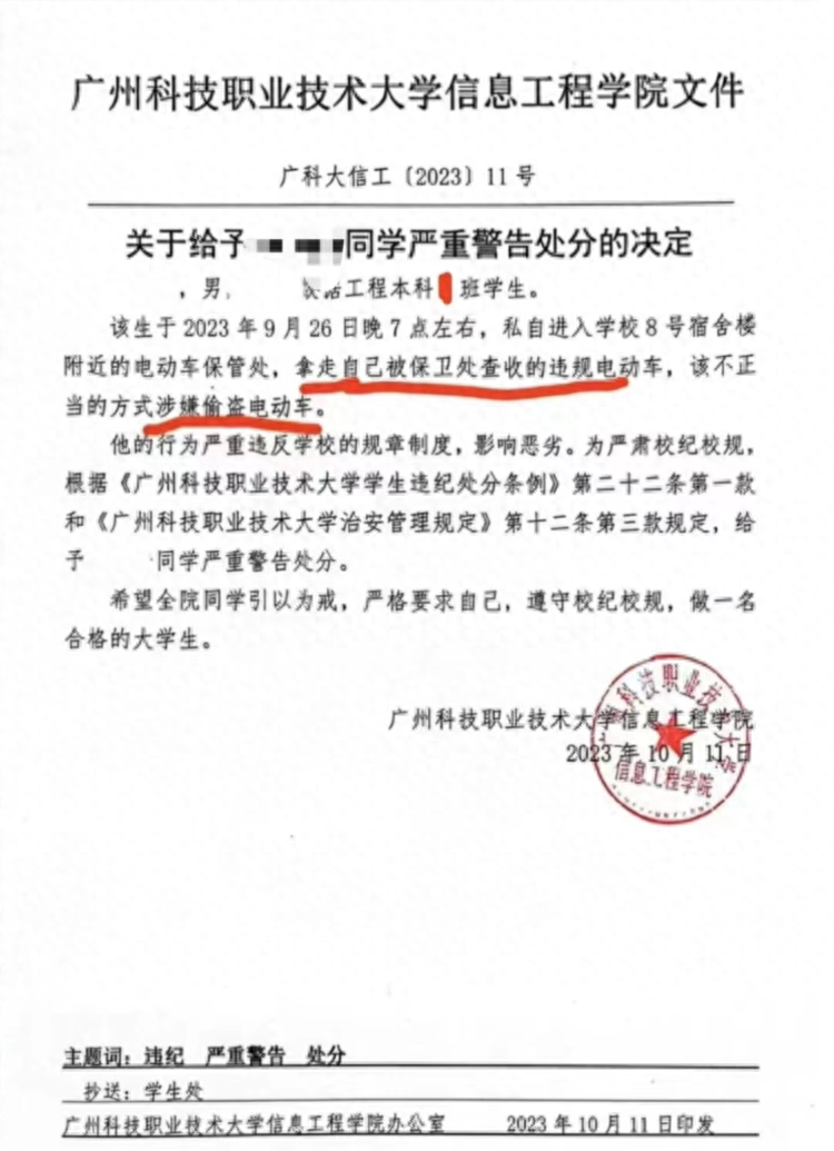 近日,广州科技职业技术大学信息工程学院下发的处分决定文件截图在网上引发关注。处分文件称,该学院一大学生私自取回自己被保卫处查收代保管的电动车涉嫌偷盗,学院给予其严重警告处分。有人质疑:“‘偷’回自己被违法扣押的电动车,是偷盗吗?”也有人分析:“不应该算偷,应该说他私自取回,不算违法算违纪”“这是校内处分,并不涉及法律问题。”