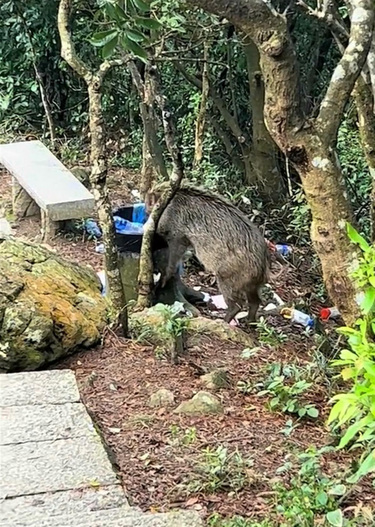 野猪在景区垃圾桶觅食