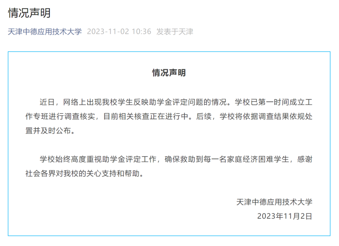 11月2日,天津中德应用技术大学发布情况声明,称学校已第一时间成立工作专班进行调查核实,目前相关核查正在进行中。后续,学校将依据调查结果依规处置并及时公布。