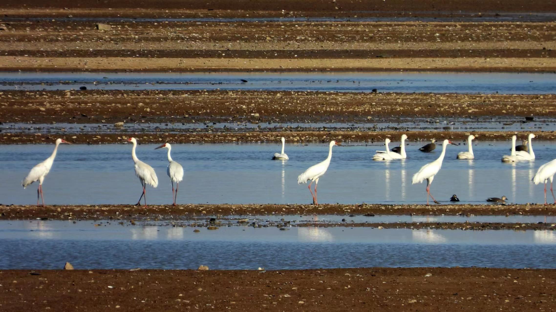 白鹤是国家一级保护野生动物,被誉为鸟类“活化石”,全球种群数量约为5000多只,每年全球95%的白鹤会前往鄱阳湖越冬。(总台记者 范存宝)
