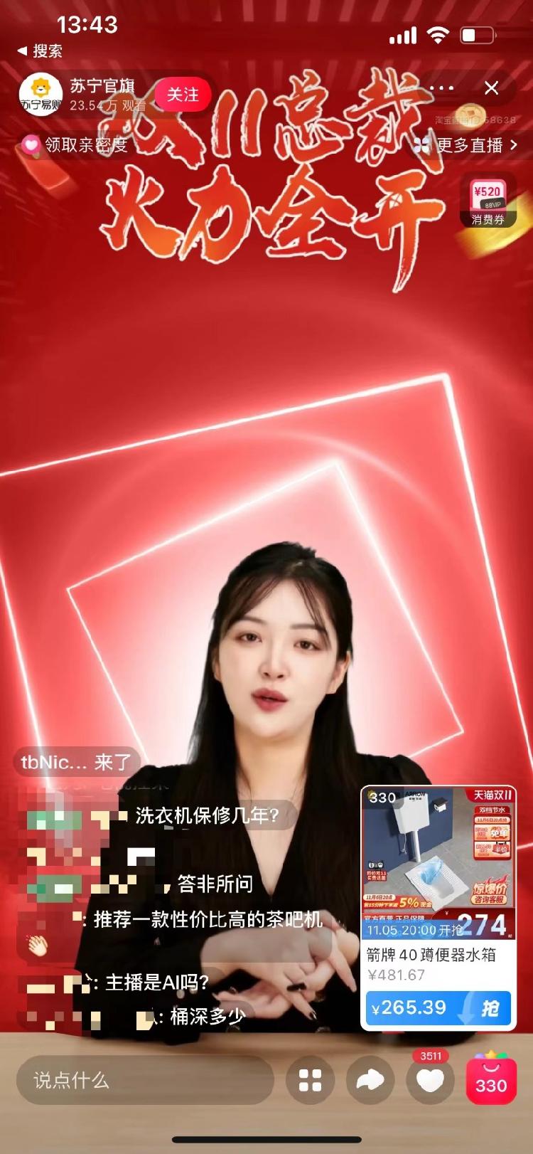 上午11点,在苏宁易购天猫官方旗舰店的直播间,温柔耐心的主播小姐姐端坐在“双11火力全开”的背景板前,有条不紊地卖着货。换手势、歪头笑、上新品,如果不仔细观察,观众会觉得这就是名普通主播,然而,间隔30秒就会出现的肢体动作循环露了馅,屏幕前竟是个数字人。